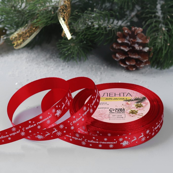 Лента атласная 1,2 см красная "С Новым годом"