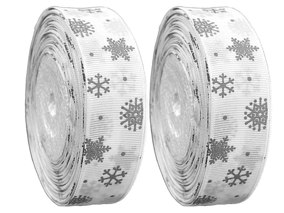 Лента атласная 2,5 см белая с серебряными снежинками, 22м